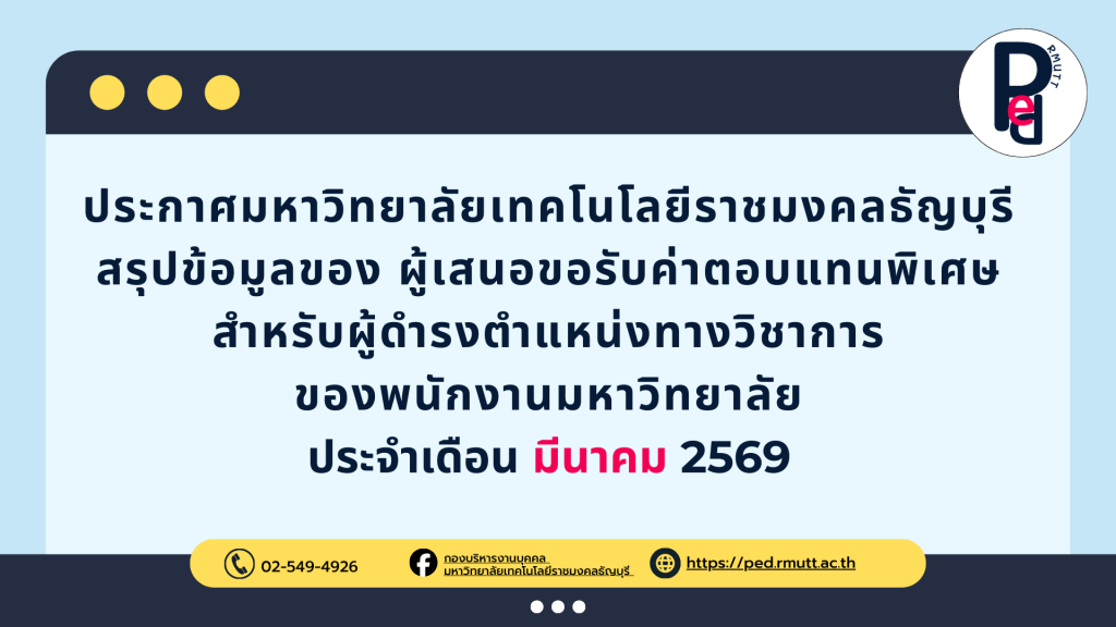 ประกาศมหาวิทยาลัยเทคโนโลยีราชมงคลธัญบุรี เรื่อง รายชื่อบุคคลผู้ได้รับการคัดเลือกเพื่อเข้ารับการประเมินตำแหน่ง ระดับชำนาญการ (กรณีปฏิบัติงานเฉพาะด้านหรือเฉพาะทาง)31/01/2023รายงานความก้าวหน้าการเสนอขอกำหนดตำแหน่งทางวิชาการ (ข้อมูล ณ เดือน กุมภาพันธ์ 2566)02/02/2023 Published by on 01/02/2023 Categories การดำรงตำแหน่งที่สูงขึ้น Tags >> ดาวน์โหลดไฟล์ Scan หรือ กดที่นี้ << สอบถามเพิ่มเติม กองบริหารงานบุคคล Post Views: 1,430 Share0 Related posts02/03/2026รายงานความคืบหน้าผู้ที่อยู่ระหว่างดำเนินการเข้าสู่ตำแหน่งที่สูงขึ้นของบุคลากรสายสนับสนุน (ข้อมูล ณ เดือน มีนาคม 2569)Read moreขอแสดงความยินดีกับ26/02/2026กองบริหารงานบุคคล มหาวิทยาลัยเทคโนโลยีราชมงคลธัญบุรี ขอแสดงความยินดีและชื่นชมกับบุคลากรสายสนับสนุนในโอกาสได้รับการแต่งตั้งให้ดำรงตำแหน่งทางวิชาชีพRead moreขอแสดงความยินดีกับบุคลากรสายวิชาการ25/02/2026กองบริหารงานบุคคล มหาวิทยาลัยเทคโนโลยีราชมงคลธัญบุรี ขอแสดงความยินดีและชื่นชมกับบุคลากรสายวิชาการในโอกาสได้รับการแต่งตั้งให้ดำรงตำแหน่งทางวิชาการRead more Comments are closed.