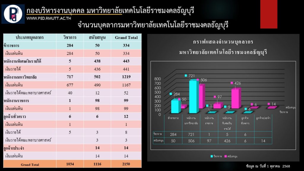 ประกาศมหาวิทยาลัยเทคโนโลยีราชมงคลธัญบุรี เรื่อง ผลการสอบแข่งขันเพื่อบรรจุเป็นพนักงานมหาวิทยาลัย สายสนับสนุน ตำแหน่งนักวิชาการศึกษาปฏิบัติการ คณะเทคโนโลยีคหกรรมศาสตร์26/09/2025รายงานความคืบหน้าผู้ที่อยู่ระหว่างดำเนินการเข้าสู่ตำแหน่งที่สูงขึ้นของบุคลากรสายสนับสนุน (ข้อมูล ณ เดือน ตุลาคม 2568)01/10/2025 Published by hangbody on 01/10/2025 Categories สถิติบุคลากร Tags สถิติบุคลากรสถิติบุคลากร มทร.ธัญบุรี สถิติบุคลากร มทร.ธัญบุรี ข้อมูล ณ วันที่ 1 ตุลาคม 2568 คลิกดูข้อมูล Post Views: 63 Share7 hangbody Related postsสถิติบุคลากร 09 02/09/2025สถิติบุคลากร มทร.ธัญบุรี ข้อมูล ณ วันที่ 1 กันยายน 2568Read more01/08/2025สถิติบุคลากร มทร.ธัญบุรี ข้อมูล ณ วันที่ 1 สิงหาคม 2568Read more01/07/2025สถิติบุคลากร มทร.ธัญบุรี ข้อมูล ณ วันที่ 1 กรกฎาคม 2568Read more Comments are closed.