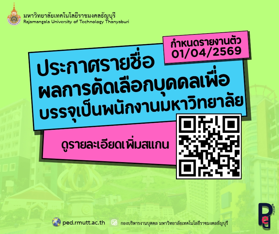 16/03/2026กองบริหารงานบุคคล มหาวิทยาลัยเทคโนโลยีราชมงคลธัญบุรี ขอแสดงความยินดีและชื่นชมกับบุคลากรสายวิชาการในโอกาสได้รับการแต่งตั้งให้ดำรงตำแหน่งทางวิชาการ